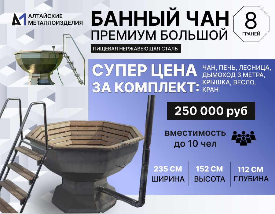 Для Банного чана доступны два варианта исполнения: из нержавеющей стали толщиной 3 мм или из стали марки AISI 304 толщиной 2 мм. Печь может быть изготовлена из нержавеющей стали толщиной 4 мм либо 3 мм. В конструкции реализован принцип кругового нагрева воды через печь, благодаря чему прогревается не только дно, но и весь объем воды, циркулирующий через нагревательный контур.
