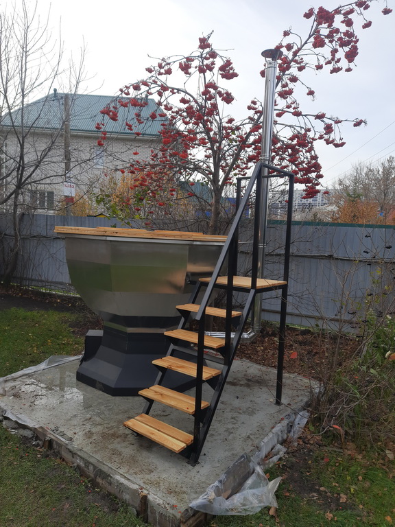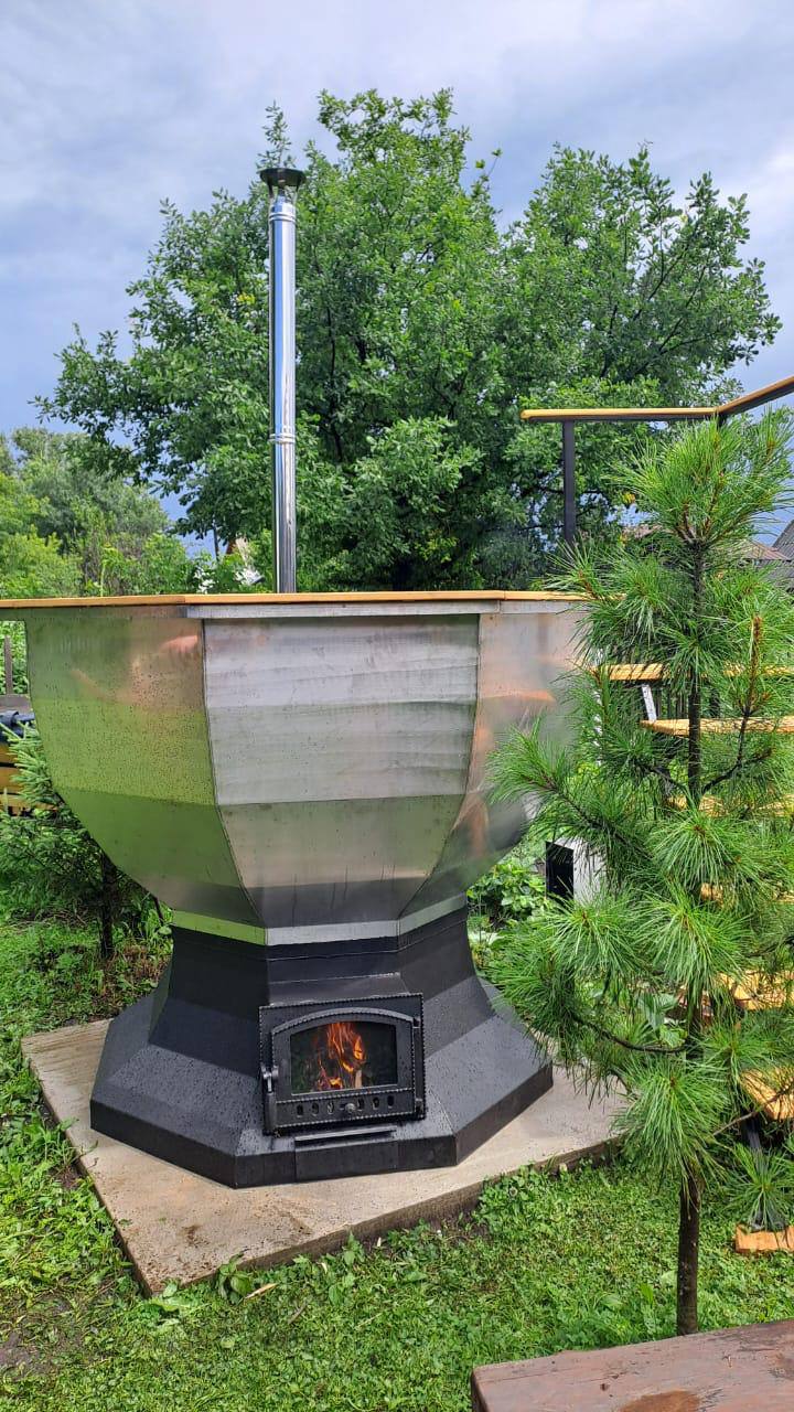 Банный чан доступен в двух вариантах исполнения: из стали толщиной 3 мм или из нержавеющей стали марки AISI 304 толщиной 2 мм, дополняется усиленным дном и печью из стали толщиной 4 мм, в которой реализован эффективный круговой нагрев воды.
